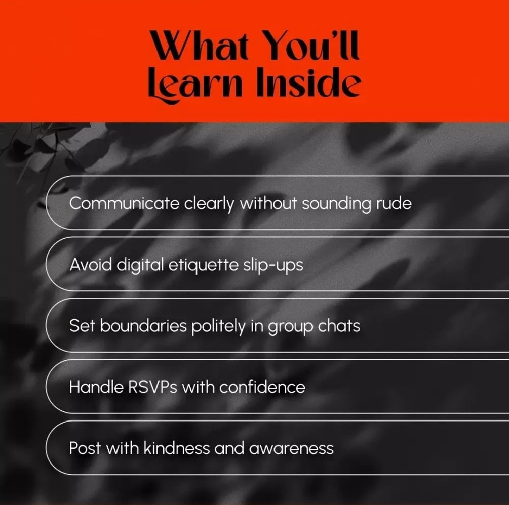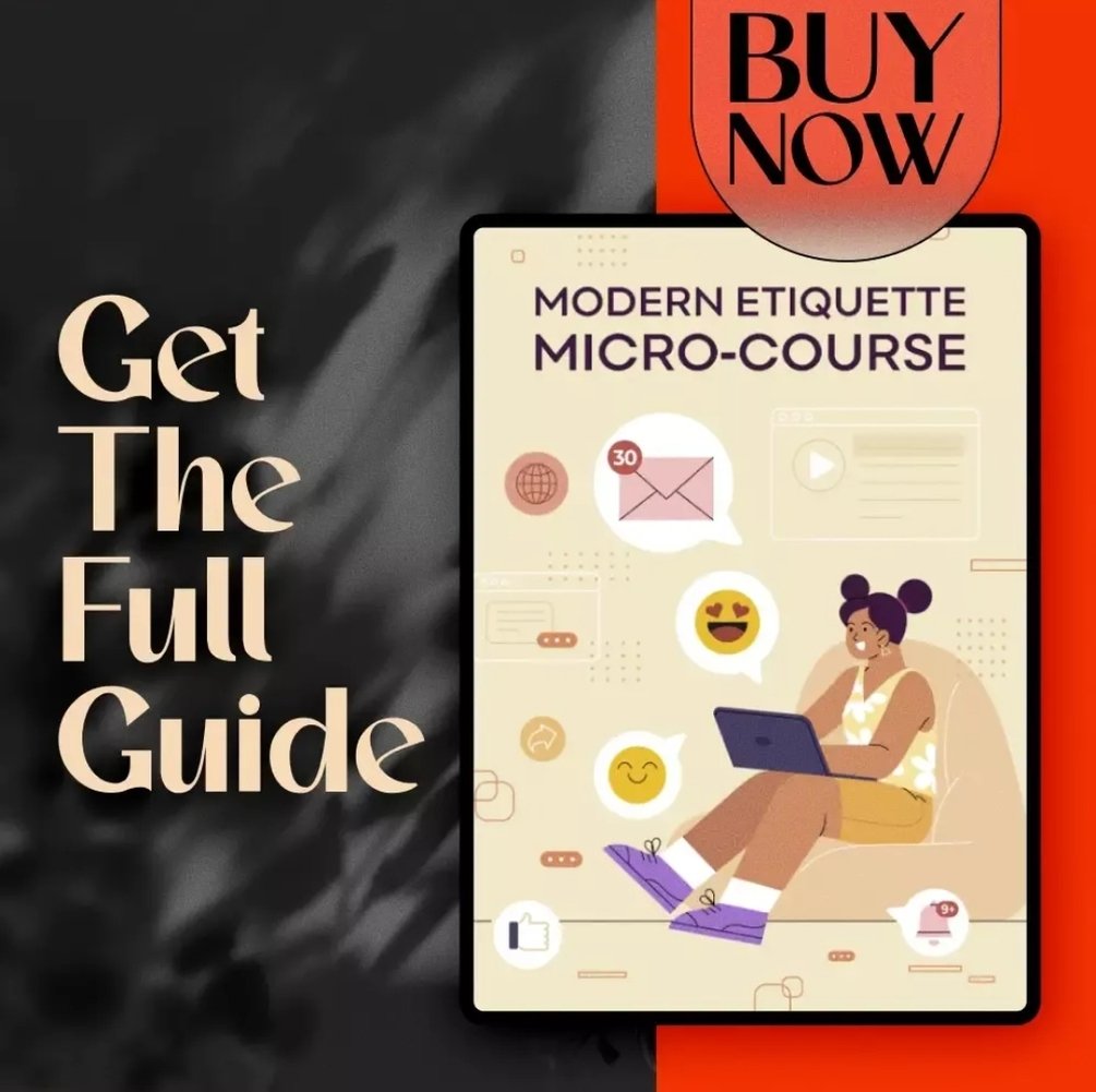 Unlike long or outdated etiquette manuals, the Modern Etiquette Micro-Course gives you fast, modern solutions to real-life digital dilemmas. With clear examples and real-world scenarios, it’s not about being perfect—it’s about being thoughtful and aware.